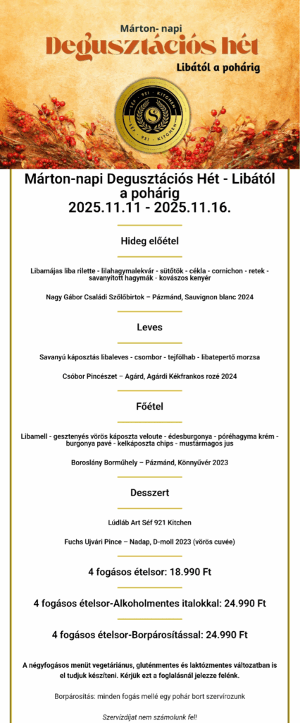 Különleges Márton-napi fine bistro degusztációs menü, ahol minden fogásban a liba és az őszi ízek harmóniája kel életre – borral vagy alkoholmentes italpárosítással.